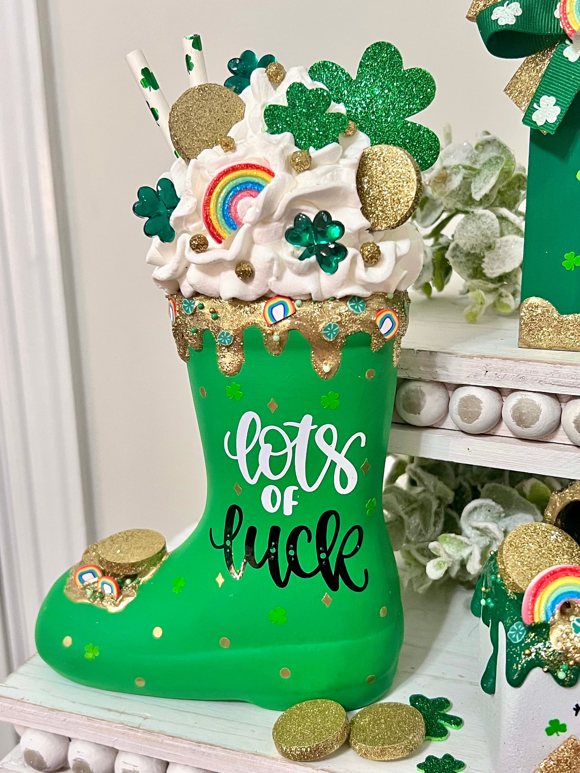 boot: Our boots have become quite a highly requested item with each theme.. even when I debate leaving them off, they end up being added due to so many requests! This cutie will be no different I’m sure! hand painted green to match last years set! filled with whip and all things SPD!! gold glittered drizzle and an adorable saying and embellishments on the toe makes this cutie a must have! 7.5 x 4x4”