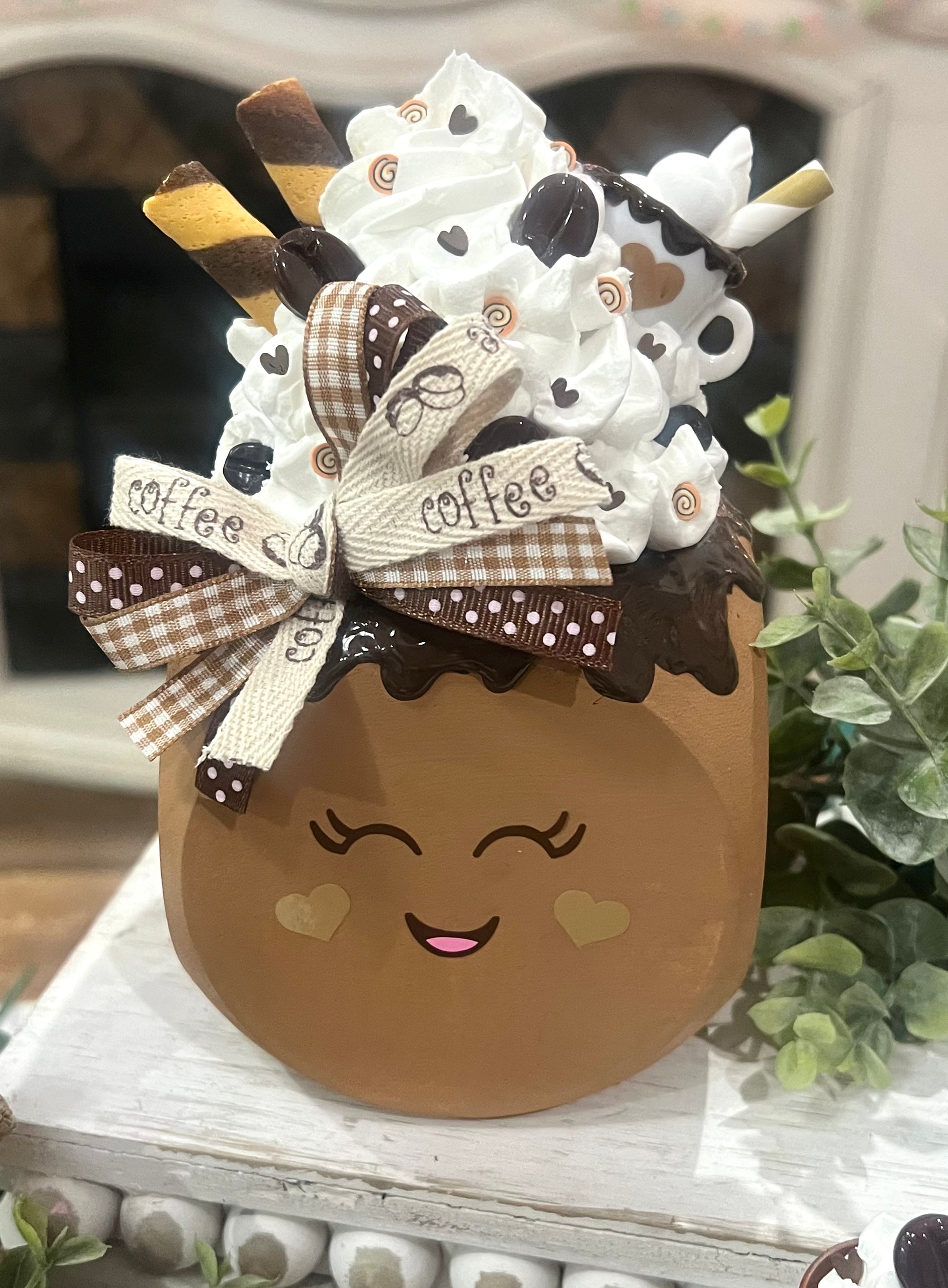 XL Mallow: Our XL Mallow is painted a beautiful coffee color and topped with whipped topping, coffee beans, sprinkles, cofffee sticks and a little coffee mug etc. A sweet face and adorable bow finishes this cutie off. It comes with your choice of added burlap sack with spoon OR just the mallow by itself, no sack/spoon. Choose in the variations option. Save with our combined pricing. 4x6x4”