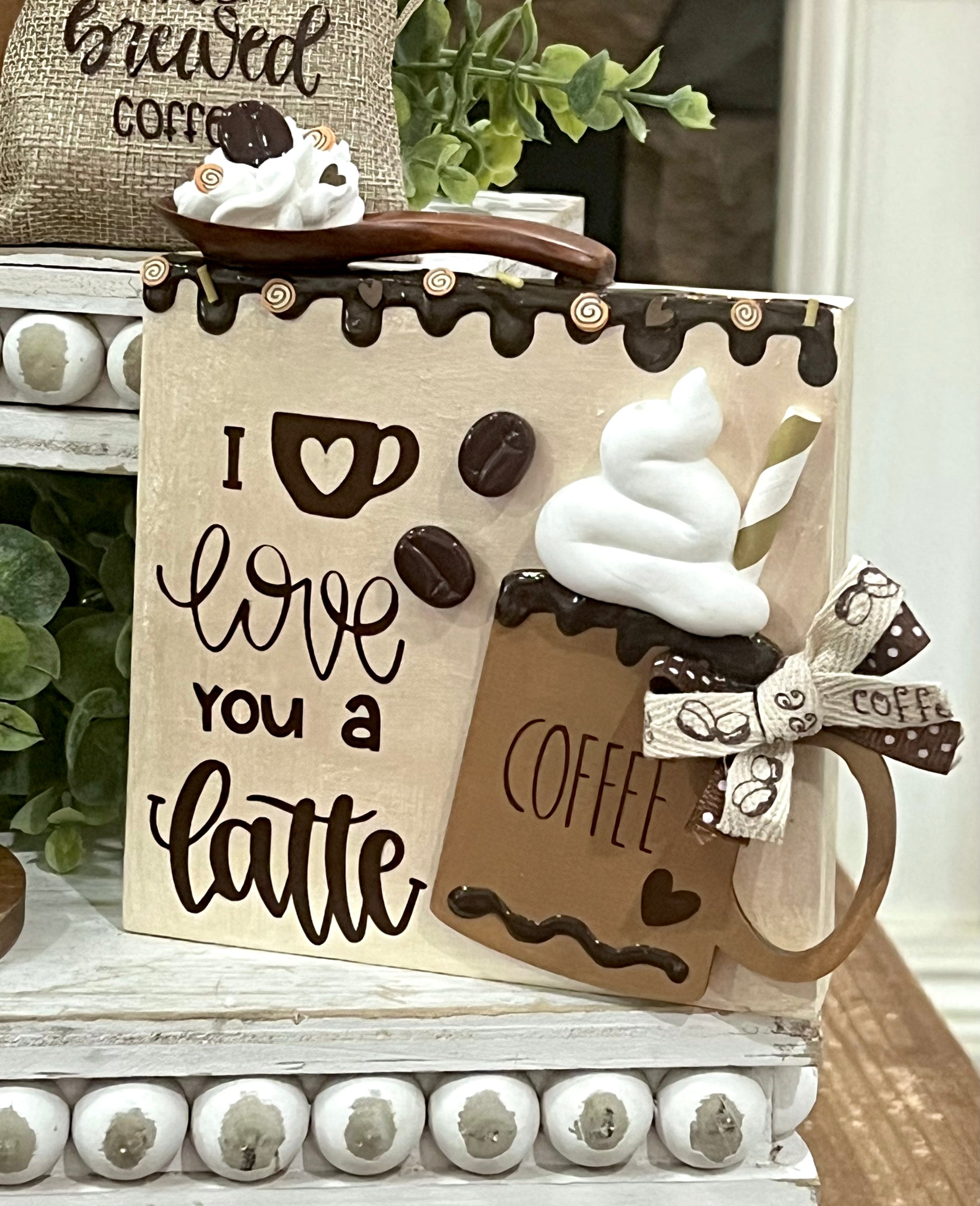 Wood Sign: Our wood sign is painted in the same matching champagne color and features a sweet I love you a latte saying alongside a wood coffee mug, so sweetly embellished with drizzle, whip and a bow and also permanently attached on top of the sign is a wood spoon also embellished. 5x4x1”